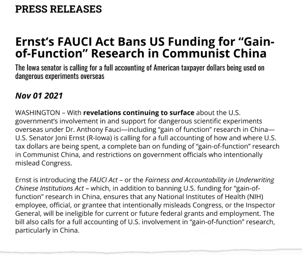We’re grateful for Senator Ernst’s tireless efforts to fight for transparency and against wasteful, dangerous spending. As Justin said: “Shipping U.S. tax dollars to a notorious Chinese Communist Party-run bioagent lab in Wuhan for treacherous gain-of-function animal experiments was a recipe for disaster. We applaud Senator Ernst for introducing the FAUCI Act to protect taxpayers and public health from dangerous and wasteful spending in China and to hold NIH officials and grantees accountable for not being forthright with Congress.”