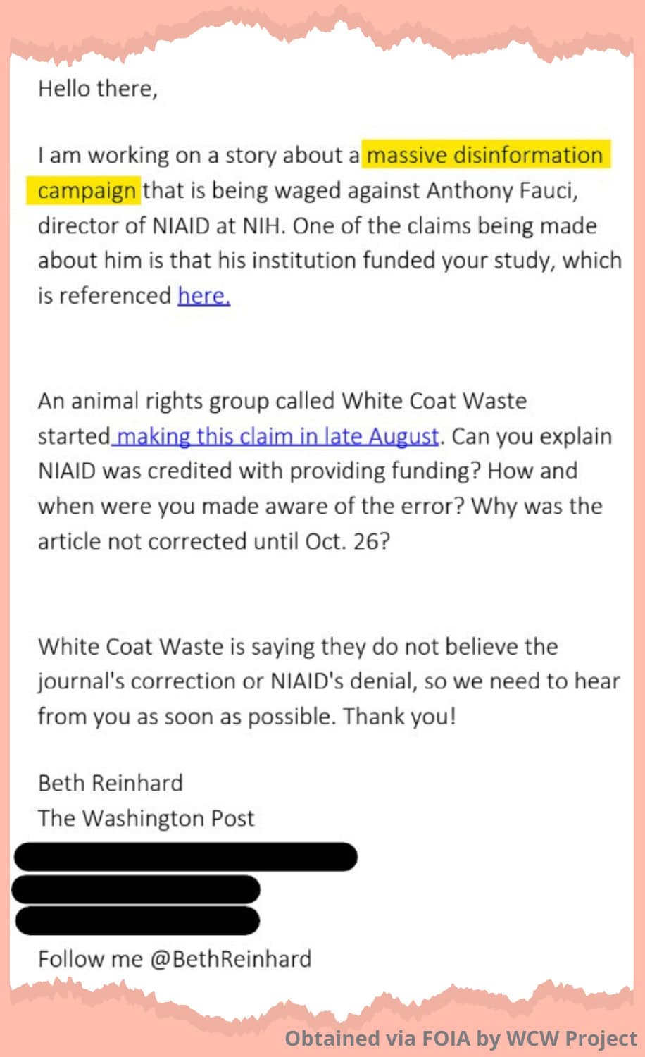 We had already filed Freedom of Information Act (FOIA) requests to get more information about NIAID’s Tunisian experiments, long before the journal did an about-face, and before ‘fact-checkers’ tried to slime us.
